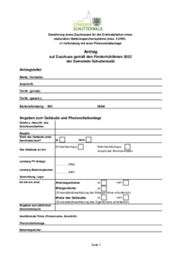 Gewährung eines Zuschusses für die Erstinstallation eines stationären Batteriespeichersystems (max. 5 kWh) in Verbindung mit einer Photovoltaikanlage Antrag auf Zuschuss gemäß den Förderrichtlinien…